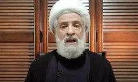 נעים קאסם נואם, מנהיג חיזבאללה בטלוויזיה במהלך עצרת סולידריות עם איראן, ביירות, לבנון, 26 בינואר 2026