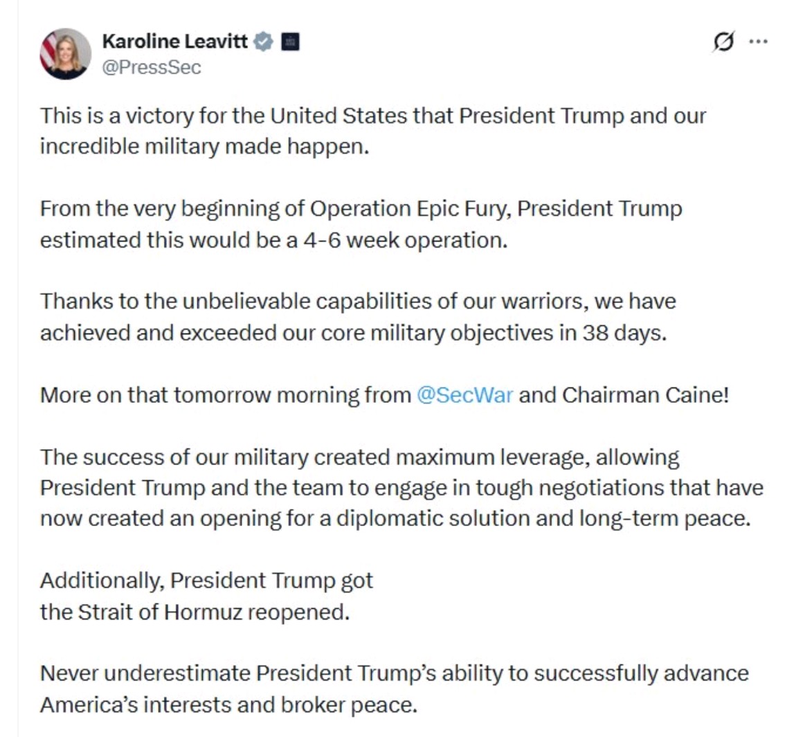 📷 דוברת הבית הלבן: "מדובר בניצחון עבור ארה"ב, הנשיא טראמפ הביא לפתיחה מחודשת של מצר הורמוז"