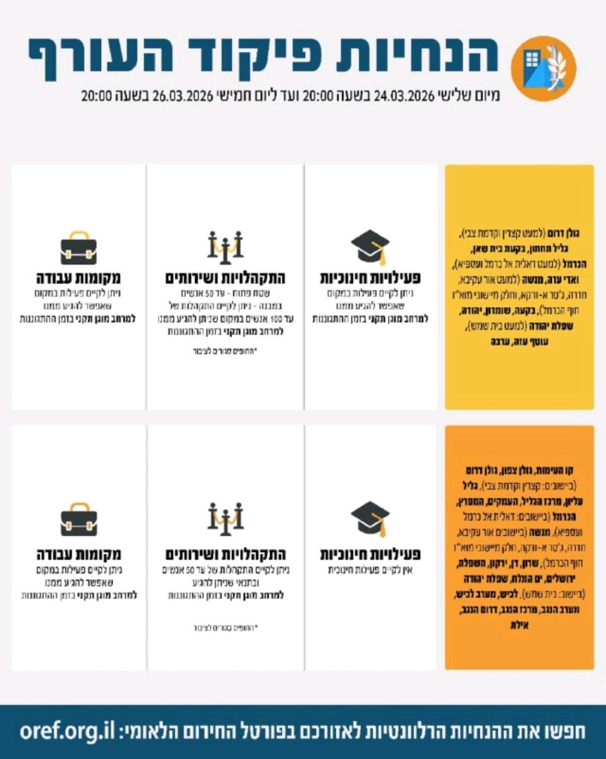פיקוד העורף: ההנחיות יישארו ללא שינוי עד ליום חמישי בערב