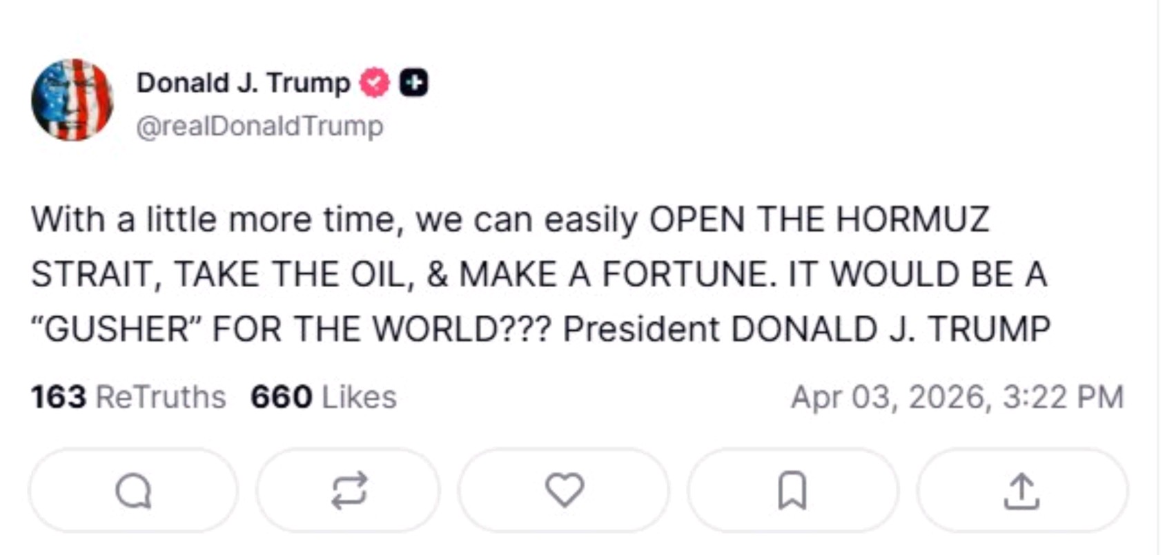 📷 טראמפ: עם עוד קצת זמן, נוכל בקלות לפתוח את מצר הורמוז, להשתלט על הנפט - ולעשות הון עתק